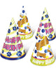 Get the party started with these Dog Birthday Cone Hats Pack of 4. Included is four cardstock party hats in two different designs. One design features blue paw prints on a white and yellow background with the words 'happy birthday' written in pink and the other features bone shaped dog treats on a spotty background with the words happy birthday written in white. Combine with our range of 'dog party' party supplies including party cups, party plates, tablecovers and more.