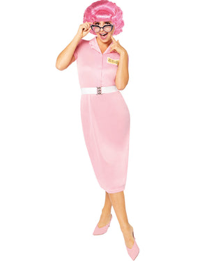 You too can be a Pink Lady in this Grease Frenchy Womens Costume. The costume includes a light pink coloured midi length dress with collar and nametag. Also included is a white belt with silver buckle. All you need is a pink wig and you're good to go!