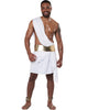 Become this majestic god and ruler from ancient Greece in our Zeus Mens Costume featuring a white toga edged in greek patterned braid silver belt head band and wrist cuffs. Lightening bolt also included. Good costume for a historical themed party. Just don't think you'll be able to control the weather.