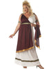 Be the beautiful goddess that you are in this Roman Empress Womens Plus Size Costume. This flattering dress includes a white tunic with an attached maroon drape. A gold chevron design crosses the mid section of the dress, and matches up with the included armbands and the detail on the hemline. Medallions are attached to the shoulders for that regal look. All of Rome will bow to you!