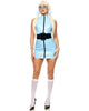 This Everything Nice Womens Costume is a vibrant ensemble that captures the playful essence of Bubbles from The Powerpuff Girls. This striking blue vinyl mini dress features a zip-front and mock neck, designed to hug your curves with minimal stretch. The wide buckle belt cinches your waist, adding a touch of boldness. Complete with pom-pom hair accessories, character-inspired eyewear, and white knee-high socks, this outfit is perfect for costume parties or themed events. Pair it with high heels for a chic look or add some playful makeup to enhance your cartoon character vibe.
