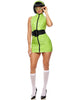This Spice Womens Costume is a vibrant green ensemble that transforms you into a sleek undercover agent, inspired by Buttercup from The Powerpuff Girls. The zip-front mock neck vinyl mini dress hugs your curves with minimal stretch, accentuated by a wide buckle belt for a cinched waist. The look is completed with white knee-high socks, a green headband, and stylish green glasses, embodying the ultimate spy allure. Perfect for Halloween or themed parties, this costume invites you to step into a world of adventure.