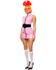 Unleash your inner cartoon diva with this Sugar Womens Costume, inspired by Blossom from The Powerpuff Girls. This vibrant pink vinyl mini dress hugs your curves with a zip-front mock neck design. Complete with a wide buckle belt, knee-high socks, a playful bow headband, and glasses, this ensemble is perfect for making a statement at any costume party. Whether you're channeling your favourite animated character or simply want to stand out, this costume offers minimal stretch for a snug fit. Pair it with bold makeup and high heels to complete your look and turn heads wherever you go.