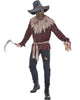 Make a chilling impression this Halloween with our Bad Harvest Scarecrow Mens Costume. This spine-tingling costume includes a black foam hat with a rope hatband, a red and black plaid long sleeve top with straw detail at the wrists, and a printed burlap belt and collar with jagged edges. Complete with a scary burlap-style mask featuring menacing Scarecrow facial features and an included silver plastic scythe prop, this costume is perfect for anyone looking to send shivers down spines on Halloween night.