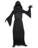 Haunt the night with this Glow Grim Reaper Boys Costume. This spooky costume includes a black robe with printed souls at the bottom and jagged hems, as well as, a black shrouded hood, skeleton gloves, a white skeleton face mask, and a plastic collapsible scythe prop. Perfect for embodying the feared Grim Reaper, carrying souls wherever you go, this costume is ideal for trick-or-treating or any haunted Halloween event.