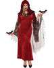 Be the dark mistress you've always wanted to when you wear this Bat Mistress Womens Costume to your next Halloween party. The costume includes a red velour dress with an attached hood and shaped black glitter collar with a jewel in the centre. The sleeves of the dress are elbow length black mesh with red spider web print and attached to the back of the dress is a tulle cape that joins to the hands with finger loops that have black bats attached to each.