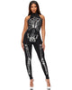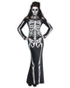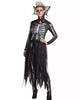 Keep your skeleton crew in line as you dress for royalty in this Gothic Skeleton Queen Womens Costume. This costume includes a black jumpsuit with a realistic white skeleton print down the front of the sleeves, torso and legs. There is a black bustle which consists of strips of black material and ties around your waist. The included tall black lace collar sits comfortably around your neck and to show you are a queen, place the included white bone crown upon your head. Complete your skeleton look further with accessories from our skeleton range. Perfect for Halloween or your next royal gathering.