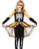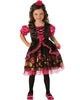 This Halloween you can't go wrong with our Day of the Dead Pink Rose Girls Costume. Featuring a day of the dead dress with a satin bodice, cross-over ties, lace loops and off-the-shoulder puff sleeves. The attached skirt features lace embellishments at the hem and day of the dead illustrations. The costume comes complete with a black headband attached with a fabric rose and a tulle veil.