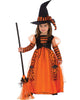Let her shine on a spooky night in this Orange Sparkle Witch Girls Costume. This enchanting costume features a black and orange dress with sweet, short puffed sleeves in a classic orange and black stripe. The black bodice is covered in a magical gold star print, and the striped waist is cinched with an adorable pumpkin buckle. A vibrant, orange sparkly tulle skirt sits over a black underlayer, while the matching black hat also features the star print and a striped hatband. To complete her spellbinding look, pair this outfit with black boots, striped tights, and her favourite broomstick. It's the perfect choice for a fun and fashionable Halloween night, a magical Book Week parade, or for casting some happy spells at a costume party.