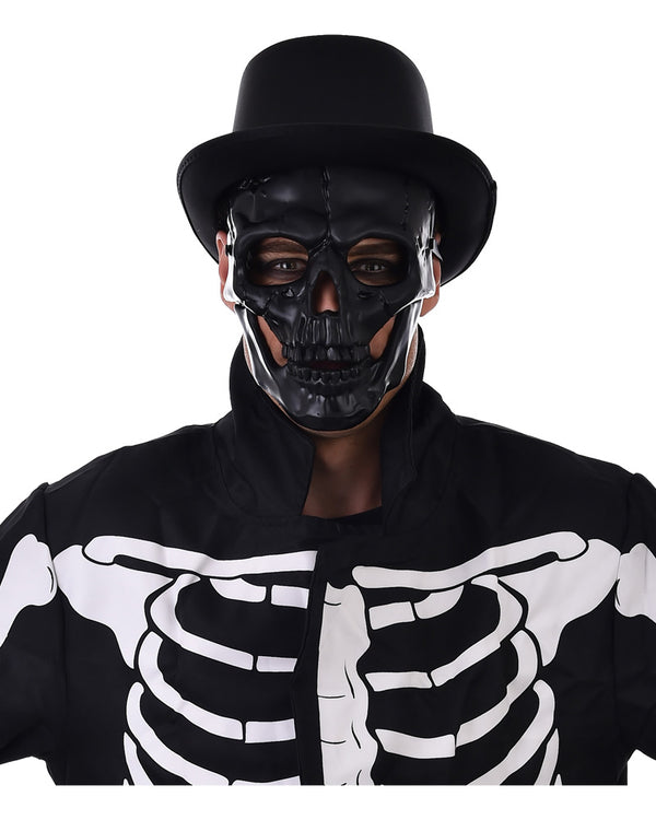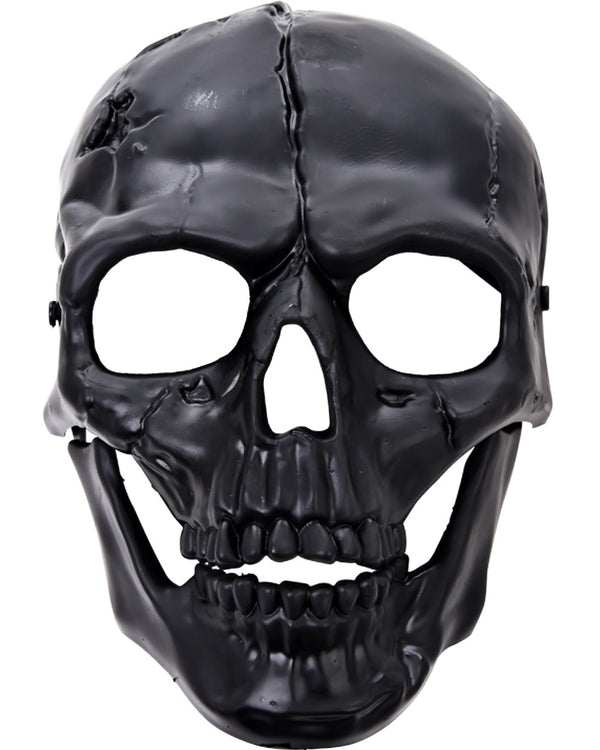 Give your costume a spooky edge with this Black Skull Half Mask. The mask is a black skull with cracked looking detail. Perfect for Halloween and Day of the Dead costumes.