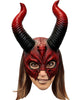 Descend to the depths of the fiery hell wearing this Devil Mythical Horned Skull Deluxe Mask. This mask sits along the top half of your head and face, covering all the way down to the tops of your lips. Mask is painted red with black shading, a 3D rams skull in the centre of the forehead and attacked at the top are two large black and red painted horns. To complete the look, pair this latex mask with our range of devil accessories and costumes.