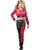 - Red satin crop jacket with front zipper and "Harley Quinn" printed on the back.