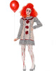 Step right up to a terrifying spectacle in the Vintage Penny Clown Womens Costume. This hauntingly beautiful costume features a grey dress, detailed with sinister red pom-poms running down the front and trimmed with tattered grey gauze at the hem. The long, grey gauze sleeves have a delicate ruffle detail, adding to the ghostly, vintage aesthetic, while a matching grey neck ruffle with a sharp red trim frames the face. To complete your horrifying transformation, pair this dress with a creepy clown wig, some ghostly white face paint, and a single, ominous red balloon. It's the perfect choice for a truly terrifying Halloween night, a horror movie-themed party, or for becoming the stuff of nightmares at any spooky event.