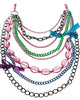 Add that extra look to your 80s outfit with this Awesome 80s Multi Chain Necklace. This totally rad necklace comes in a hot pink chain which is connected to a variety of different shapes and thickness chains and in green, pink, blue and black colours. Tied to the blue and green chain is a small blue and purple ribbons.