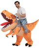 - Inflatable ride-on costume designed to look like you are riding a T-rex with a roaring mouth.