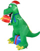 - Inflatable green T-Rex wearing Santa hat with gift in its mouth.