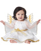 This Shimmering Starlight Angel Girls Costume is designed to make your little one look like she's flown straight from the heavens. This beautiful white dress has a unique glitter mesh sleeve cape that attaches to lovely gold cuffs at the wrists, creating an ethereal and elegant silhouette. A gold metallic belt with an attached glitter mesh overskirt drapes at the waist, while a high-low layered skirt adds a touch of whimsical drama. The costume is completed with a pair of stunning embossed metallic gold wings and a headband with a gold tinsel halo, ensuring she's a true star. Perfect for costume parties, nativity themed events, or theatrical performances, pair it with glittery makeup and golden accessories for a truly ethereal look.