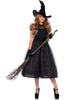 Dress up in this elegant Darling Spellcaster Witch Womens Costume and cast a spell or two. The vintage inspired tea length dress has a sheer glitter skirt, puff sleeves and a lace covered neckline. A wide belt and crooked black hat completes the costume.