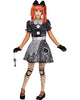 Transform yourself into a living doll with this Broken Doll Womens Costume - a hauntingly beautiful twist on a classic look. This satin-like black dress features black-and-white striped sleeves and hem, with heart and stitches prints that add that extra touch of detail. The square neckline with pleated white trim gives the look that old-time doll feel, while a satin sash ties it all together. The costume also includes cracked-effect footless tights, black and white striped hair bow and a black choker. This broken doll costume will definitely turn heads this Halloween.