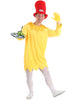Enter the magical world of Dr Seuss with this Dr Seuss Sam I Am Adult Costume, from the classic children's book Green Eggs And Ham. This licensed costume includes a long-sleeve tunic in the Crayola yellow, and a lava red top hat. Tunic has saw-tooth hem and yellow faux fur trim on the cuffs and collar. Hat features 'Sam I Am' logo. Also included is a 2D felt prop 'tray' depicting green sliced ham and two sunny-side-up green eggs, in the same illustration style as the book. Pair with black or white pants or leggings, and start polishing up on your favourite rhymes from the story. Perfect for Book Week, kids parties and more.