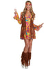 Groove to the beat of the 60s with this Groovy Lady Women's Costume! This vibrant ensemble transports you straight back to the era of flower power and free love. The multi-coloured sixties-style dress features flared sleeves and a scoop neckline, perfect for dancing the night away. Over the top of the dress sits the included brown suede waistcoat adorned with fringe detailing, a green flower, peace symbol, and 'FREE LOVE' printed on the front. Don't forget to top it off with the matching headband for that ultimate hippie-chic vibe! Embrace your inner flower child and spread peace and love wherever you go!
