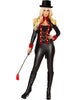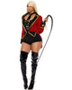 Step right up and dazzle the crowd in our Classic Ringmaster Womens Costume. This showstopping costume features a captivating all-in-one satin dress with a flared black skirt adorned with red and gold accents along the hemline. The bodice is white, designed with a sweetheart neckline, sparkles with red and gold glitter detailing, perfectly complementing the dark red cropped tailcoat. The tailcoat is adorned with black lapels, metallic gold swirl details, and bold blue cuffs on the sleeves. Top off the look with the included black top hat, embellished with gold rope and buttons, for a commanding presence that's both sultry and sophisticated. Complete the look with accessories from our circus range.