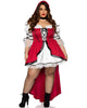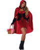 Bold, beautiful and undeniably bewitching, this Gorgeous Storybook Red Riding Hood Plus Size Womens Costume is a sultry, detailed twist on the classic storybook character. This enchanting ensemble features a white and red peasant-style dress with off-the-shoulder ruched sleeves, delicate lace trim on the sleeves and hemline, and elegant black ribbon lacing along the bodice and arms. Satin trims add a hint of sheen, while the included black satin choker ties the look together with a touch of gothic romance. Draped over your shoulders, a dramatic red crushed velvet hooded cape completes the storybook fantasy.