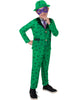 Embrace your inner mastermind with The Riddler Deluxe Boys Costume. This villainous ensemble includes a green jacket and pants, both covered in an enigmatic question mark print. The digitally printed shirt panel features a striking purple tie adorned with a large question mark, while the pants have an elastic waistband for comfort. Top off the look with a green bowler hat, complete with a question mark motif, and a purple felt eye mask with an elastic strap.