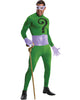 Solve puzzles and leave a trail of question marks wearing our DC Comics The Batman The Riddler Mens Costume. This sinister costume features a digitally hyper-real printed long sleeve green costume top with an attached hood, perfectly replicating The Riddler's iconic jacket and top from the DC film, The Batman. The white question mark logo prominently displayed on the 'jacket' adds an authentic touch. Complete the look with a green vinyl face mask, designed with eye holes and attached costume clear glasses, creating the eerie illusion of a taped-shut mouth. Become Gotham's most enigmatic antagonist with this chilling costume.