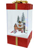 This Musical Snowing Present White LED is perfect for adding an extra flare to your Christmas home decor. This decoration comes in the shape of a tall red glitter present with gold glitter 'ribbon'. The centre of the box is clear with a snow scene inside. The scene is a tall house with a lamb post, Santa, carolers and two large pine trees behind the house. Surrounding the house and scene are tiny white foam balls, as snow.