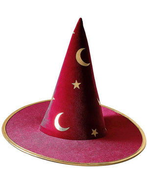 Top off the magic of your little ones look with this Velvet Burgundy Magician Hat. This adorable hat features a sumptuous burgundy velvet fitted with gold moons and stars throughout and also features a gold brim. Perfect for those who love to play dress-up and embrace their inner magician, this hat offers both style and comfort with its easy-to-wear design. Whether they're attending a costume party or casting spells in the backyard, this magician's hat is sure to make them feel like the star of the show. Pair this hat with matching Fancy Dress Burgundy accessories or mix and match to create a unique look that's as enchanting as your little one's imagination. Perfect for Halloween, dress up parties and much more.