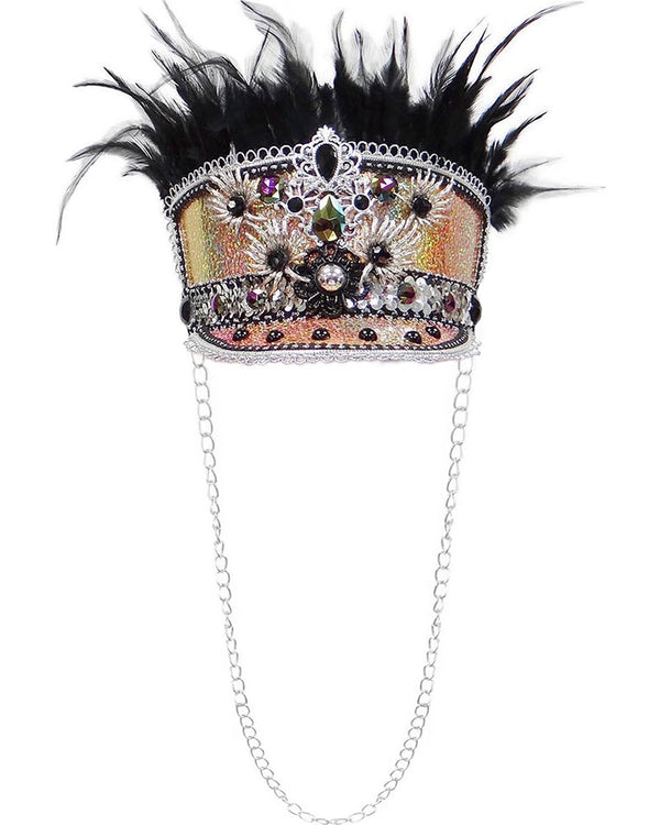 A statement piece is everything when it comes to festivals so be sure to add this Paradiso Festival Visor to spice up your outfit! The visor features a fun holographic finish and is decorated with an assortment of black and silver jewels and silver chain detail, as well as a feathered top lining the edges of the visor to look like a plume of black feathers. Perfect for completing your stylish Mardi Gras costumes or festival outfits to stand out in any crowd.