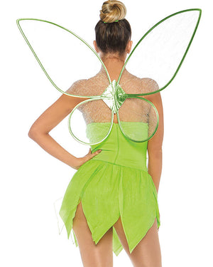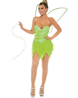 Fly to neverland and wendy, peter pan, and all the rest with our Pretty Pixie Womens Costume. This irresistible fairy costume is fantastic for any fairy-themed party or even for your next festival. Featuring a leafy green dress with a green glitter pedal-style skirt, clear straps, and a plunging neckline. The costume comes complete with a pair of fairy wings with a green outline and a green ribbon hair piece. Finish the look with a pair of stockings.