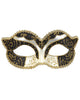 Wear this Black Fastidious Eyemask to your next masquerade ball. This black eye mask comes in a cat eye design and is decorated with black lace across the front and gold trim around the eye holes. There is an attached old-fashioned gold handle for an elegant touch. Pair this mask with other accessories from our masquerade range.