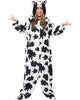 - Plush hooded jumpsuit with drop-crotch and furry cuffs.
