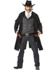 The Gunfighter Mens Costume is for men who have a taste of for the old west. The Western duster style jacket in black has wide lapels and looks just the part with the black and white striped double breasted vest underneath. A white dickey with a cravat sharpens up the look and holsters that attach to your own belt are also included. Yee haw!