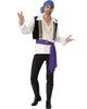Travel far and wide in this Gypsy Mens Costume. The costume includes a white long sleeve shirt with collar and ruffled cuffs as well as a black cropped vest with gold pipe detailing. Also included is a blue striped headscarf, purple waist sash and two gold necklaces.