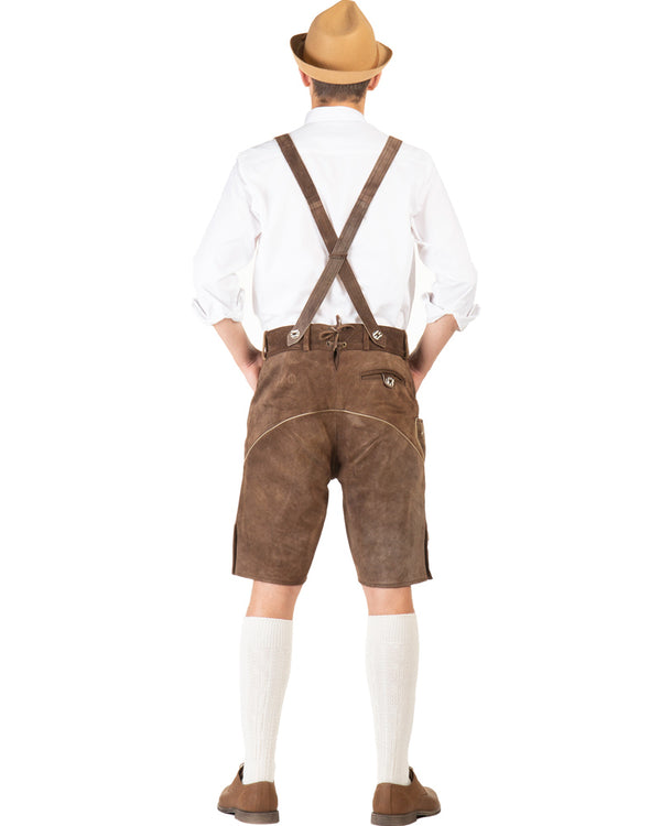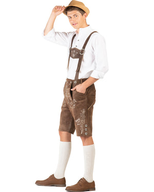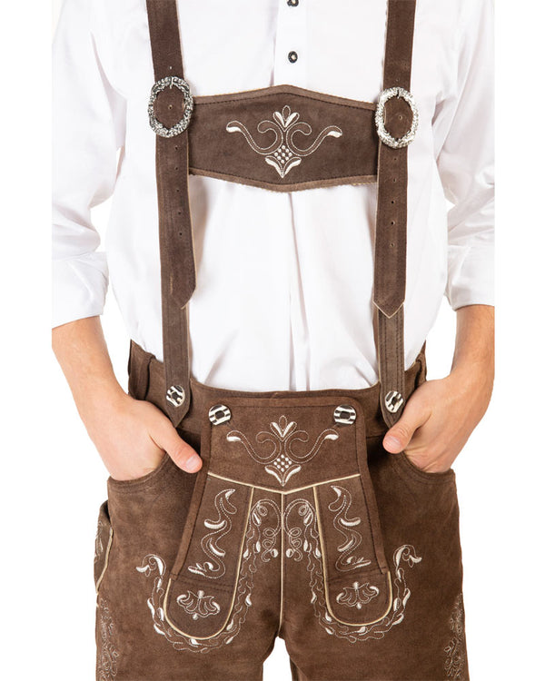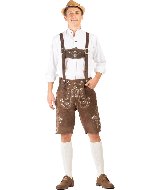 Get ready to party this year at Oktoberfest with this dashing Hans Authentic Leather Lederhosen Mens Costume. Made from 100% genuine soft brown leather, the inside of these traditional Lederhosen are lined for extra comfort. Small horn bone buttons open and close the hose just above the knee and at the embroidered flap while laces sit at the small of the back for additional loosening and tightening. Finally, traditional embroidery on the suspenders, the flap and on the side of the knee, completes the picture. With this Lederhosen on, you're ready to go out on the town.