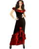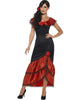 Dance the night away at your next Spanish fiesta wearing our Flamenco Senorita Womens Costume. The costume features a long black dress with a ruffled red and black polka dot bustline with a black lace hem and a red rose. The attached layered skirt is styled with matching layered red and black polka dot material. The costume comes complete with a red rose headpiece.