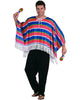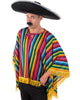 Dance your way into your next Mexican or international-themed party with this Mexican Red and Blue Poncho Mens Costume. It features bold horizontal stripes in sapphire blue and jasper red, with smaller horizontal stripes in between in apple green. There is a white neck tie and white fringe detailing along the bottom edge. Perfect for an easy, fun and recognisable look! Just add a margarita (and maybe some pants) and you're ready to go.