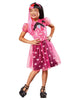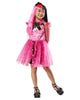 You're ready for Scaris with this Monster High Draculaura Deluxe Girls Costume. This fun, bright pink dress is the definition of vampire chic. The pink sateen bodice is printed with playful white bats, while sheer pink tulle long sleeves and a collar add a fashionable flair. The look is totally voltageous with a layered sheer pink tulle skirt and black shorts with a love heart print attached underneath. A black bat-like satin bow and a pink headband with a 3D bat embellishment complete this fang-tastic transformation. Perfect for Halloween or Monster High-themed parties.