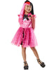 You're ready for Scaris with this Monster High Draculaura Deluxe Girls Costume. This fun, bright pink dress is the definition of vampire chic. The pink sateen bodice is printed with playful white bats, while sheer pink tulle long sleeves and a collar add a fashionable flair. The look is totally voltageous with a layered sheer pink tulle skirt and black shorts with a love heart print attached underneath. A black bat-like satin bow and a pink headband with a 3D bat embellishment complete this fang-tastic transformation. Perfect for Halloween or Monster High-themed parties.