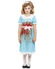 - Blue overall dress with blood patches and matching multicoloured stripes along the hemline.