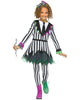 Step into the world of twisted fun with the Bad Clown Girls Costume. This eerie costumes features a grey short puff sleeve top, adorned with two sinister red pom-poms down the bodice. There is a layered grey ruffle collar for around the neck, while the included matching grey skirt, with its printed black dirt detail, gives a worn and creepy look. There is a pair of red and grey striped leggings and a red belt for around the waist to complete the outfit. Ideal for those looking to channel their inner Pennywise, this costume is guaranteed to bring some serious scares. Don't forget your red balloon.