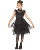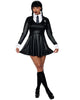 Step into the shadows of dark academia with this Gothic Academy Womens Costume. Designed for the monochrome yet enchanting academic woman, this costume features a black coated knit skater dress complete with a school crest patch on the chest and contrast white wrist cuffs. Top off your transformation with the included white dickie which has an attached tie that's perfect for channelling the dark elegance of Wednesday Addams and other gothic school characters. Whether you're wandering the corridors of a haunted academy or casting spells under the moonlight, this ensemble is sure to captivate and intrigue wherever you roam. Perfect for Halloween, dress up parties and much more!