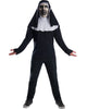 This Halloween wear our The Nun Mens Costume Top and Mask. Adapted from the demonic character seen in The Conjuring universe. The horrifying costume features a black shirt with an attached white hood and neck yoke, in addition to a black habit with white trim and a demonic nun face mask made from vinyl! Finish the look just add black pants.