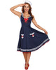 Set sail in this gorgeous All Aboard Sailor Womens Plus Size Costume. A retro style dress with a sailor collar with a red bow, sequin anchor embellished pockets and a full skirt edged with red netting. A gob hat completes the look.
