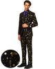 Show up in style and get ready to pop the champagne with this Opposuit Fancy Fireworks Premium Mens Suit. Included is a full-length, three-piece suit in a festive metallic gold print of stars, fireworks and champagne glasses. Jacket is fully lined, with notch lapels, padded shoulders, two-button front closure, and four-button cuffs. Trousers feature belt loops, two side pockets, two back button-through pockets, and a zip fly with hook and button closure. This premium quality suit will have you ready to celebrate day or night, a fun twist on a classic black suit fit for any event.
