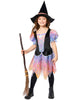 Have your little one step into the enchanting world of magic with our Ombre Witch Girls Costume, where sweetness meets spookiness in the most bewitching way! This delightful ensemble features a tall black witch hat with a thin pink strip around the base, while the glittered purple, orange, and pink dress casts a spell of charm and elegance and the black vest cutout with puff shoulders adds a hint of mystery. Complete with a silver star in the middle of the chest and colourful spider web features, this costume is sure to make her the cutest little witch in the coven! Whether she's brewing potions in her cauldron or casting spells under the moonlight, she'll be ready to spread the magic wherever she goes!