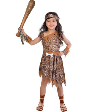 Step back in time to the prehistoric era in this Cavewoman Girls Costume. The costume includes a leopard printed dress with asymmetrical neckline and hem, with zig zag detail on both. Also included is a brown tie up belt with bone detail in the centre, two leopard print wrist cuffs with brown zig zag hemline as well as a matching leopard print bandana.